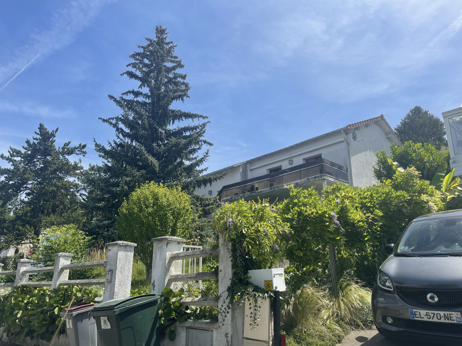 Le jardin fait environ 500m2 avec une grande terrasse carrelée et un cabanon d'environ 12m2